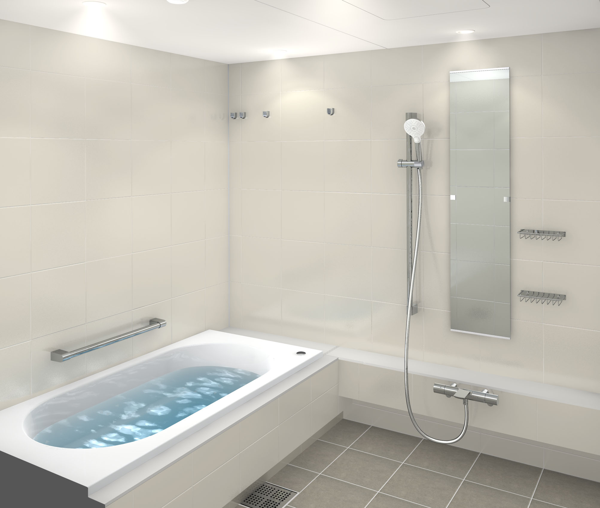 壁・床に磁器質タイルを使用した高級感あふれるユニットバス。上質なリラクゼーション空間を演出します。