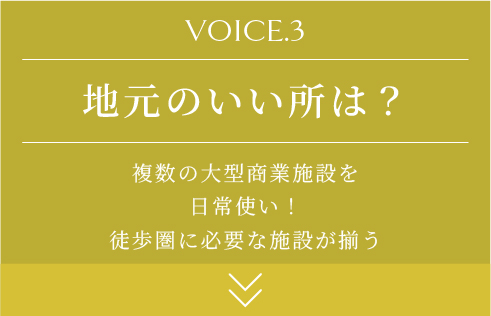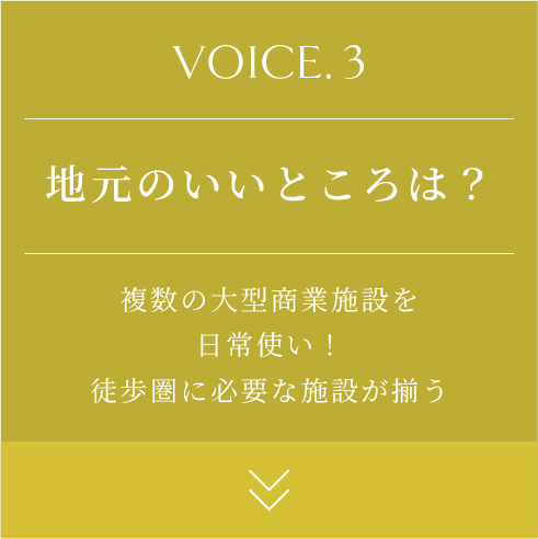 「大型商業施設の利便性」・「自然豊かな環境」・「都心へのアクセス」が3拍子そろったバランスの良さを評価する声が、在住歴や家族構成に関わらず挙がりました。