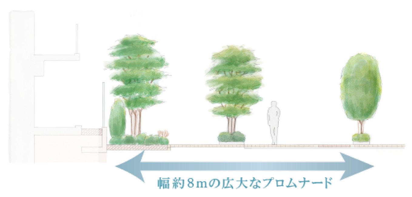 街に開くプロムナード。幅8m・奥行120mの広大な